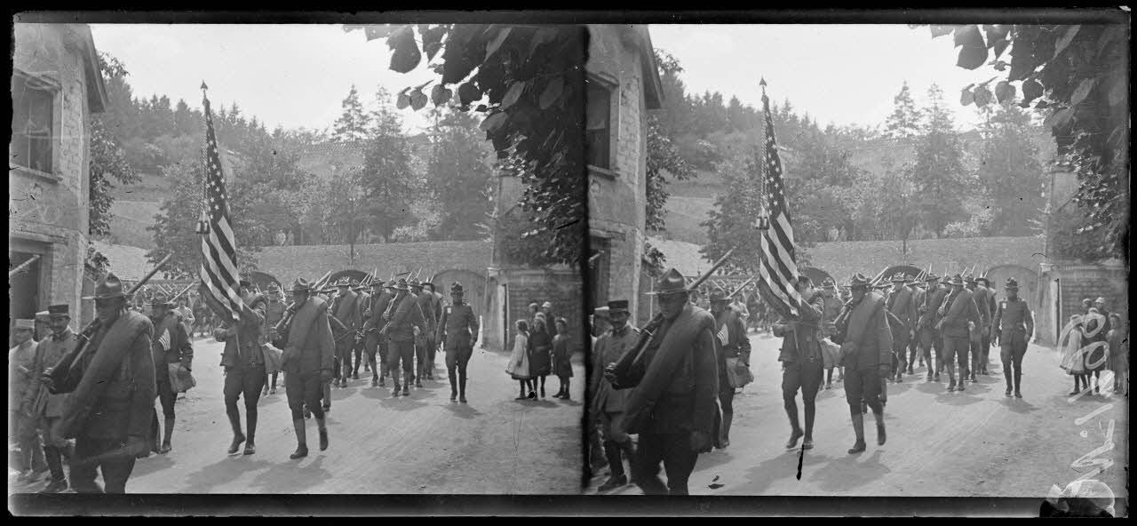 - À Châlons-sur-Marne (Marne, le 20/08/1917), les Américains sont cantonnés dans la ville. Certains soldats assistent à un spectacle du théâtre aux armées, d'autres sont rassemblés autour des faisceaux d'armes. Les troupes américaines quittent leur cantonnement pour partir à l'instruction. Des soldats visitent la ville.