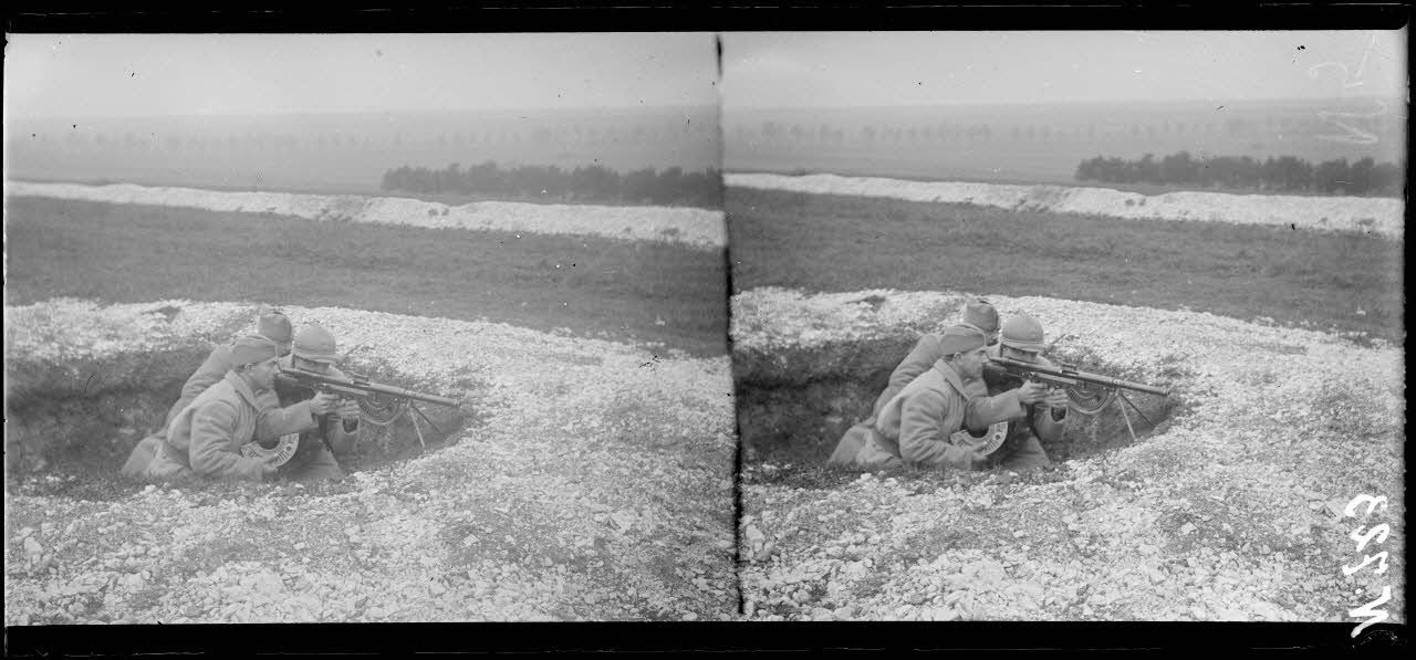 - À Châlons-sur-Marne, au centre d'entraînement des tireurs au fusil-mitrailleur Chauchat Mle 1915, les futurs fusiliers mitrailleurs apprennent les tactiques d'approche des tranchées et les techniques d'assaut de position adverse. Des officiers belges reçoivent une instruction au tir au fusil-mitrailleur.