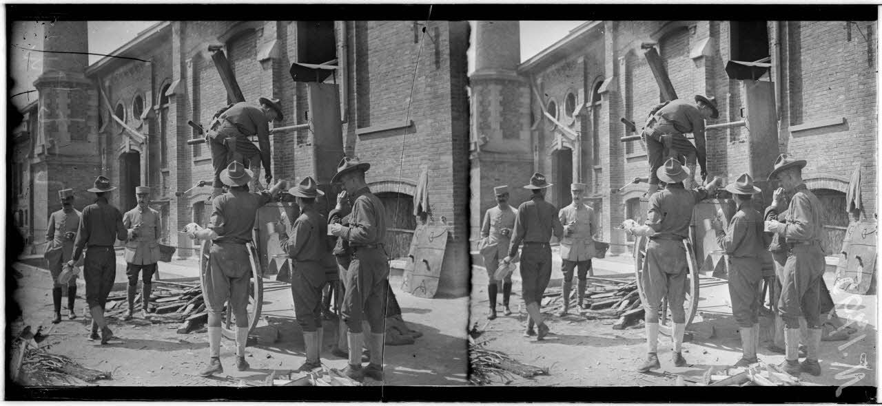 - À Châlons-sur-Marne (Marne, le 20/08/1917), les Américains sont cantonnés dans la ville. Certains soldats assistent à un spectacle du théâtre aux armées, d'autres sont rassemblés autour des faisceaux d'armes. Les troupes américaines quittent leur cantonnement pour partir à l'instruction. Des soldats visitent la ville.