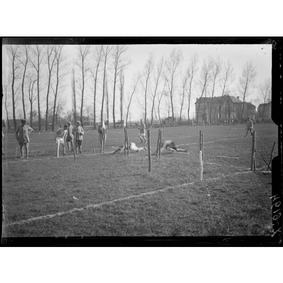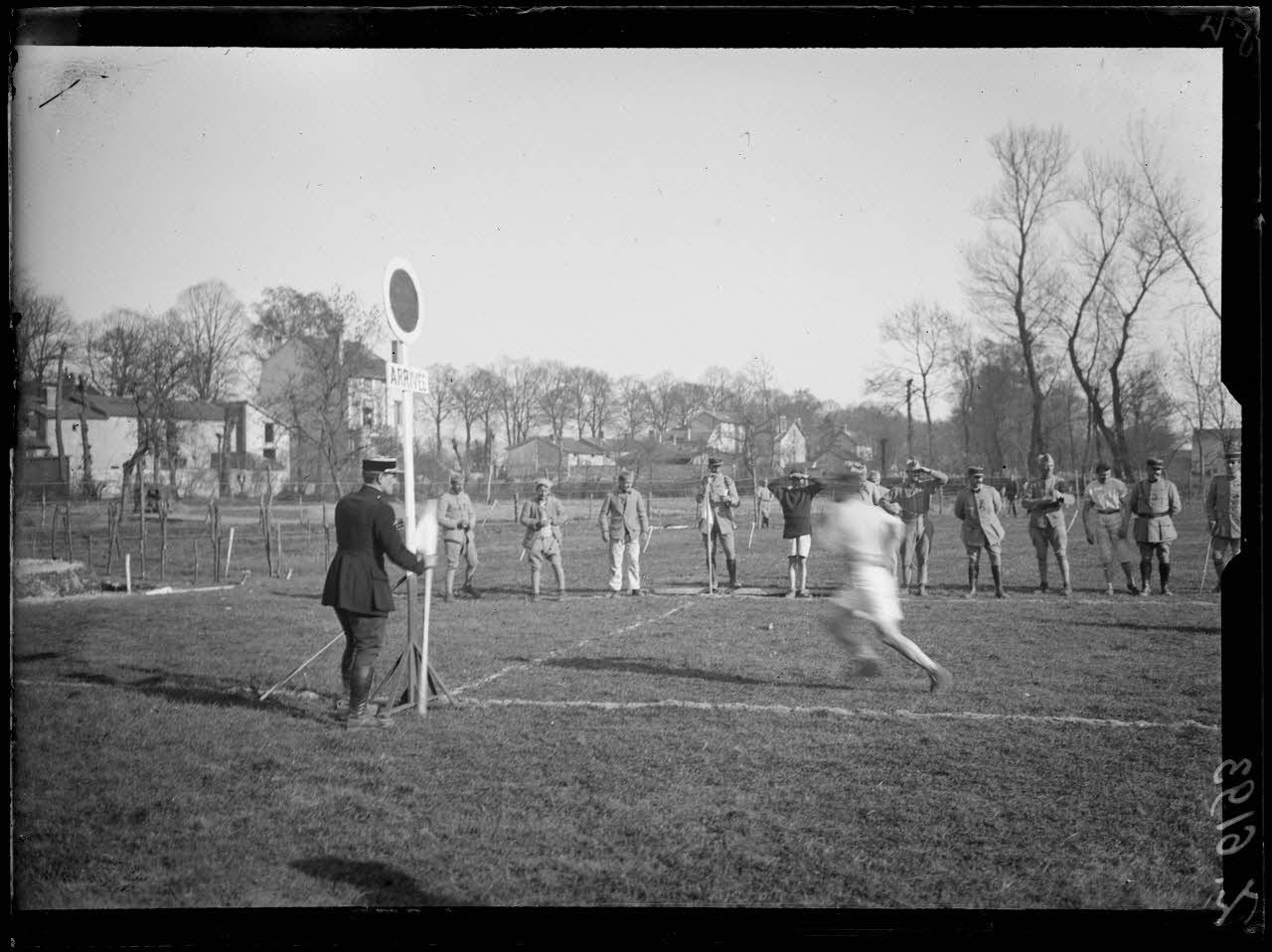 Châlons-sur-Marne (Marne). Fête sportive militaire en présence du général Gouraud. La course d'obstacles, l'arrivée du vainqueur. [légende d'origine]