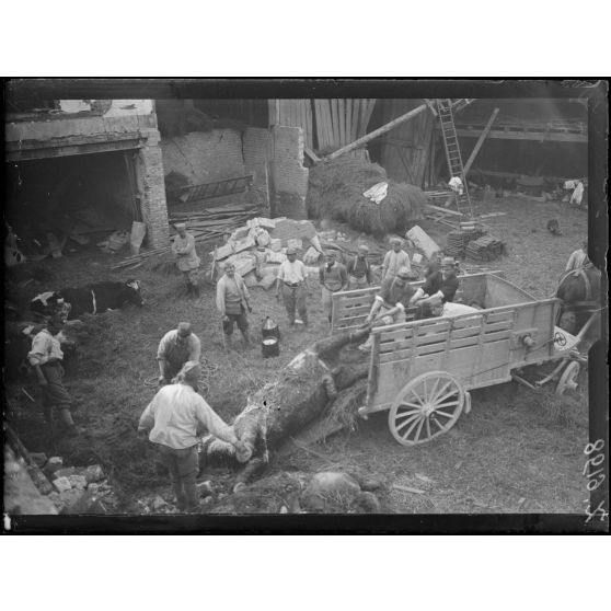 Châlons-sur-Marne (Marne). Une étable atteinte par une torpille d'avion, l'enlèvement des animaux tués.