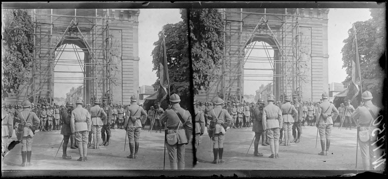 Châlons-sur-Marne (Marne). Remise de décorations devant la porte Sainte-Croix par le général Gouraud (14-7-17). [légende d'origine]