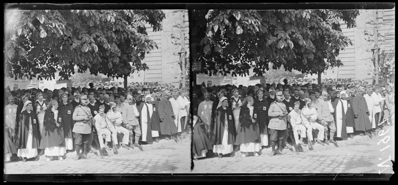 Châlons-sur-Marne (Marne). Revue des troupes américaines par le général Gouraud. Infirmiers et blessés assistant à la revue. [légende d'origine]
