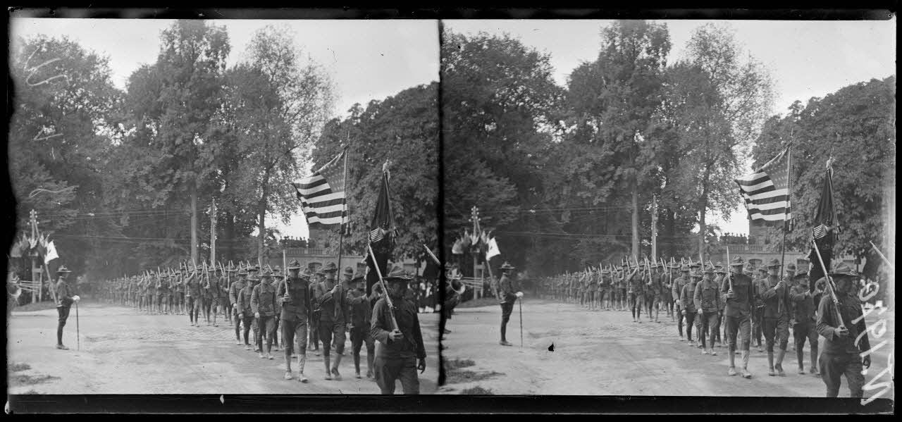 Châlons-sur-Marne (Marne). Revue des troupes américaines par le général Gouraud. Les troupes américaines défilent devant le général Gouraud. [légende d'origine]