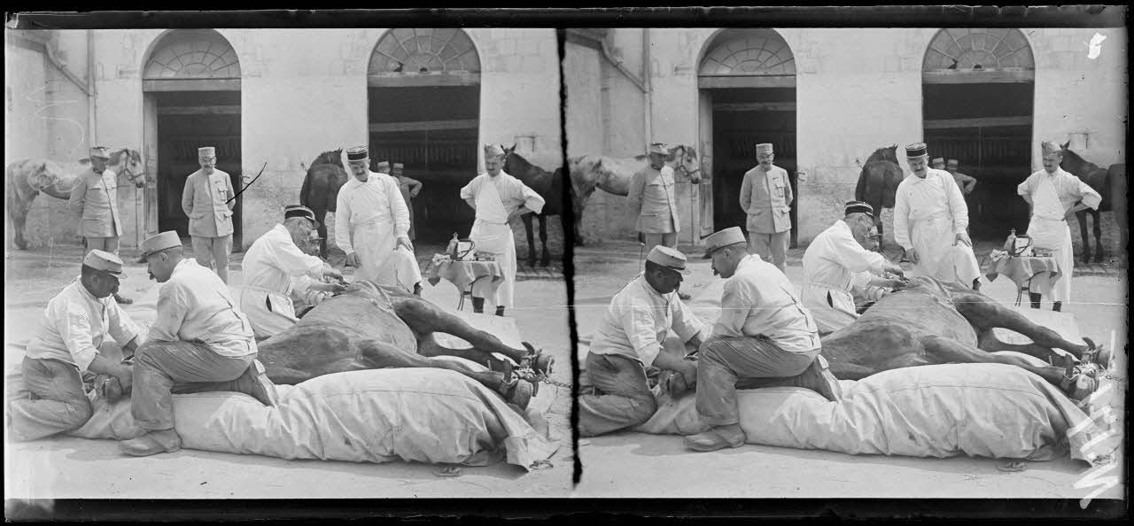 Châlons-sur-Marne (Marne). Service vétérinaire de l'armée. Cheval couché sur une litière spéciale pendant l'opération (3-7-17). [légende d'origine]