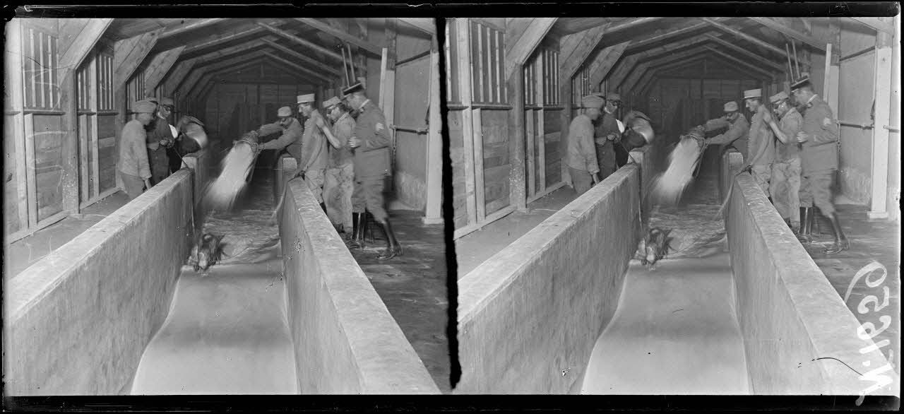 Châlons-sur-Marne (Marne). Service vétérinaire de l'armée. Cheval dans la piscine de traitement de la gale (6-7-17). [légende d'origine]