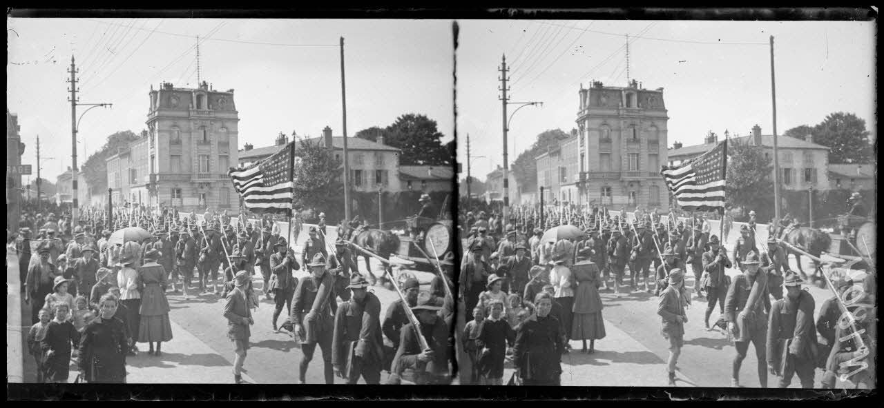 - À Châlons-sur-Marne (Marne, le 20/08/1917), les Américains sont cantonnés dans la ville. Certains soldats assistent à un spectacle du théâtre aux armées, d'autres sont rassemblés autour des faisceaux d'armes. Les troupes américaines quittent leur cantonnement pour partir à l'instruction. Des soldats visitent la ville.