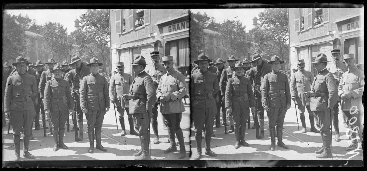 - À Châlons-sur-Marne (Marne, le 20/08/1917), les Américains sont cantonnés dans la ville. Certains soldats assistent à un spectacle du théâtre aux armées, d'autres sont rassemblés autour des faisceaux d'armes. Les troupes américaines quittent leur cantonnement pour partir à l'instruction. Des soldats visitent la ville.