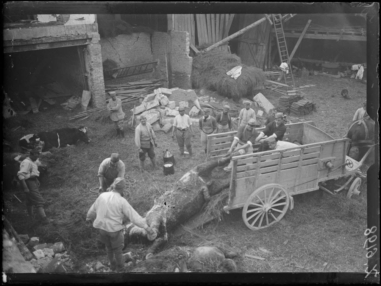 Châlons-sur-Marne (Marne). Une étable atteinte par une torpille d'avion, l'enlèvement des animaux tués. [légende d'origine]