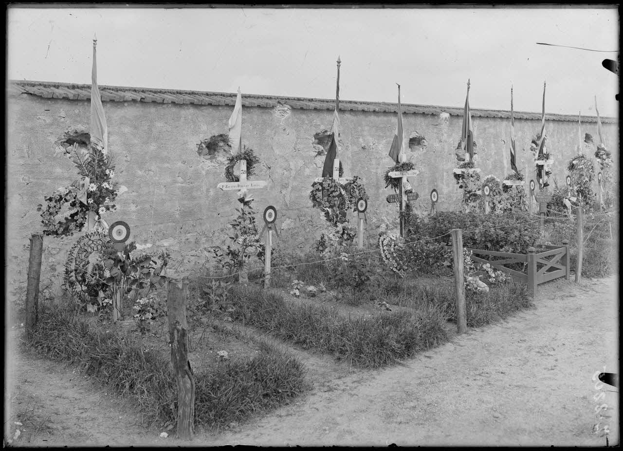 Dans différents villages de la Marne, l'opérateur photographie des cimetières militaires et ds tombes de soldats dans les champs, près des routes et près d'un passage à niveau.