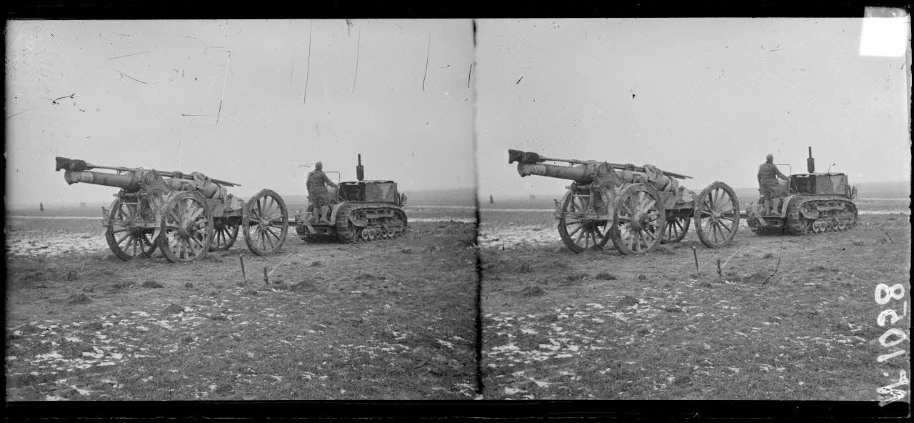 Champ d'exercice de Bouy. Tracteur caterpillar attelé à une pièce de 155 long, parmi les trous d'obus et les fils de fer.