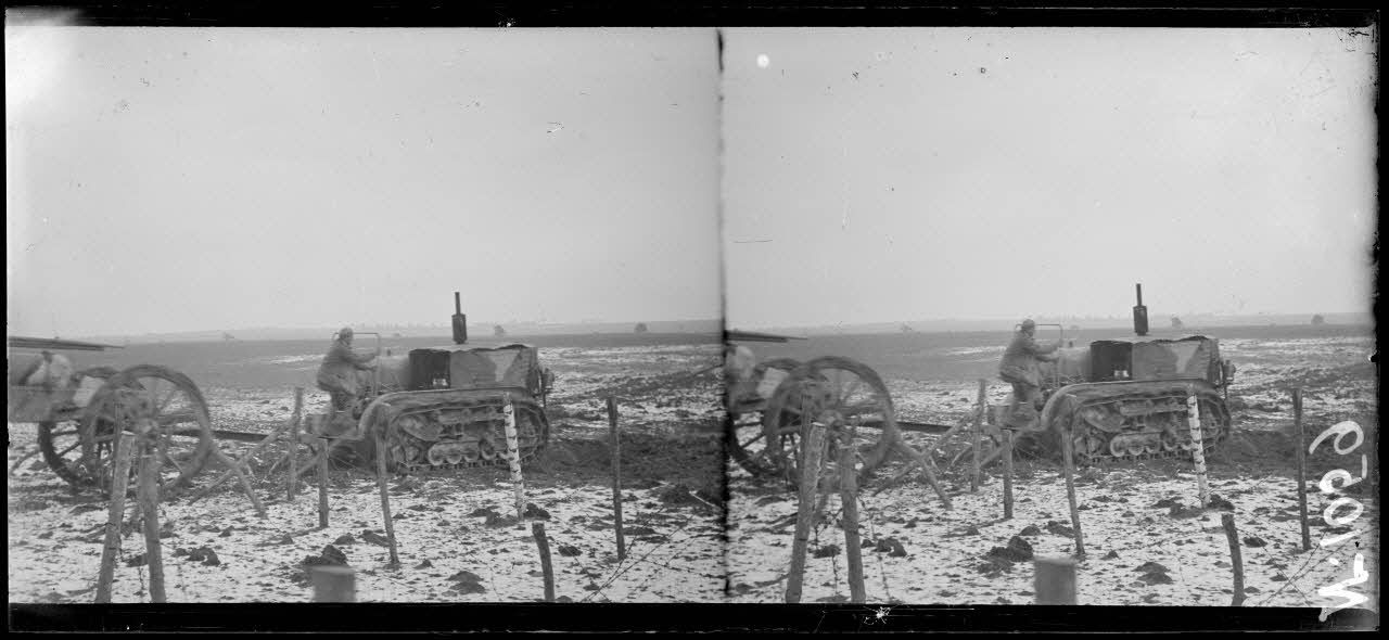 Champ d'exercice de Bouy. Tracteur caterpillar dans les trous d'obus.