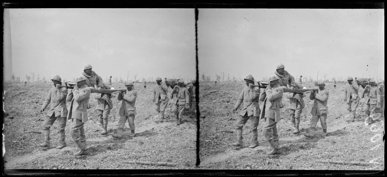 Note : voir film 14.18 A 345, TC 00:01:09. Bien que les dates diffèrent dans les registres, il est évident que les images ont été réalisées au même moment. Sur la pellicule, on distingue le photographe, de trois-quarts face au convoi transportant les civières.