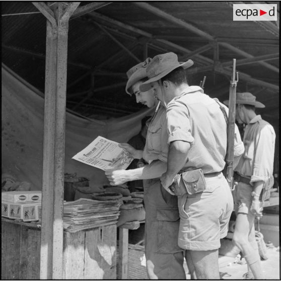 Deux soldats de la 4e compagnie du 1er bataillon du 9e régiment d'infanterie coloniale (RIC) lisant le journal "France Soir" au marché.