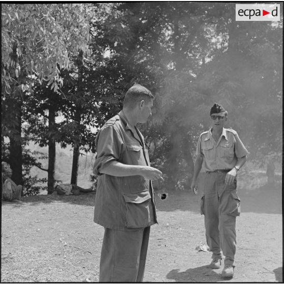 Le capitaine adjoint au commandant du 45e BIC et le lieutenant Abrial en conversation avec le chef de chantier.