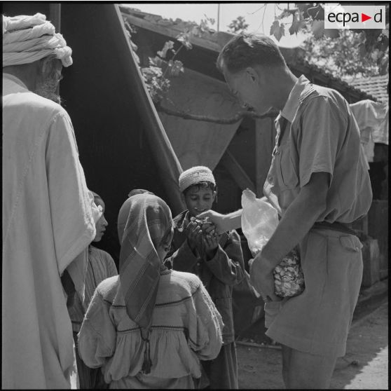 Un capitaine de la 2e compagnie du 2e régiment d'infanterie coloniale (RIC) distribuant des bonbons aux enfants de Beni Ouazedine.