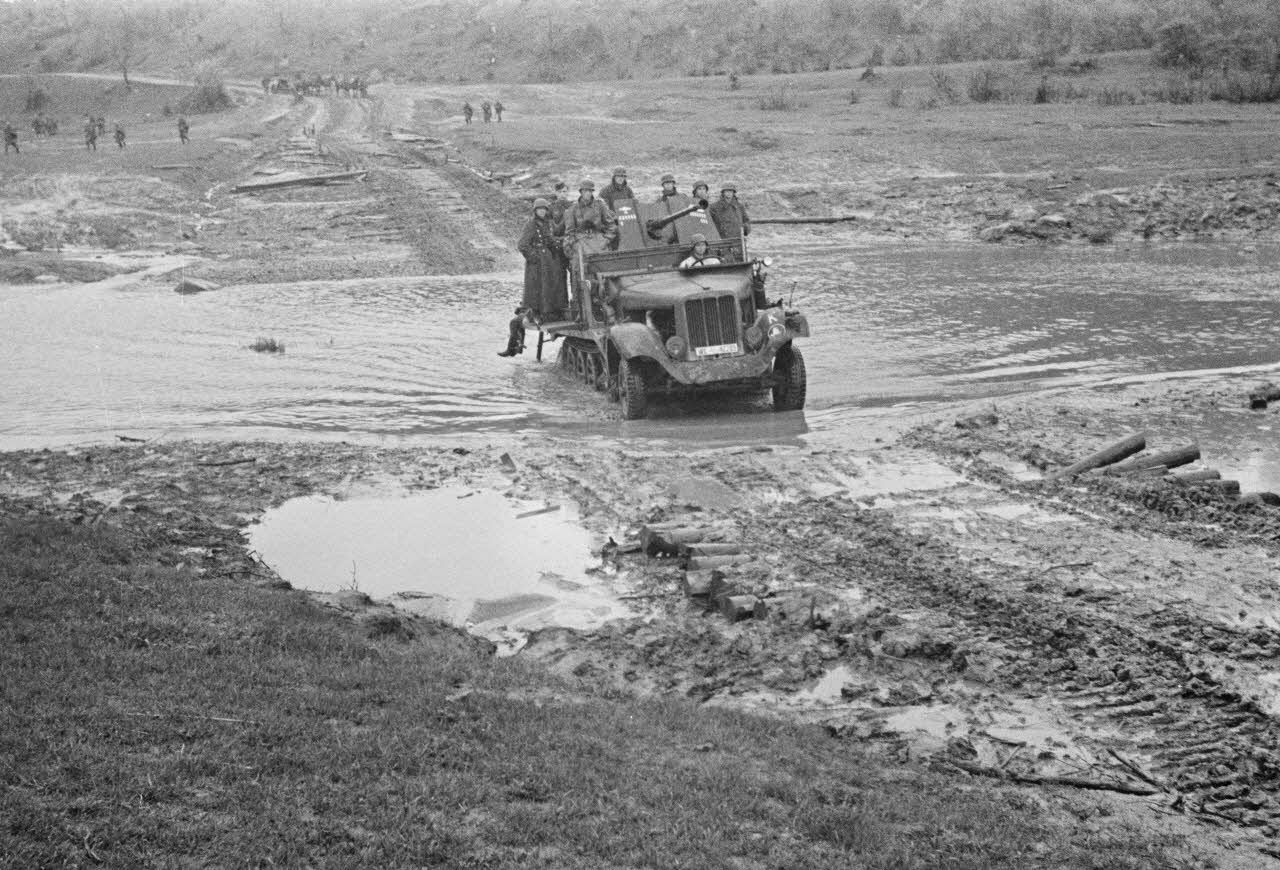 La progression de fantassins allemands soutenus par des blindés Panzer-III et un semi-chenillé Sd.kfz.6/2.