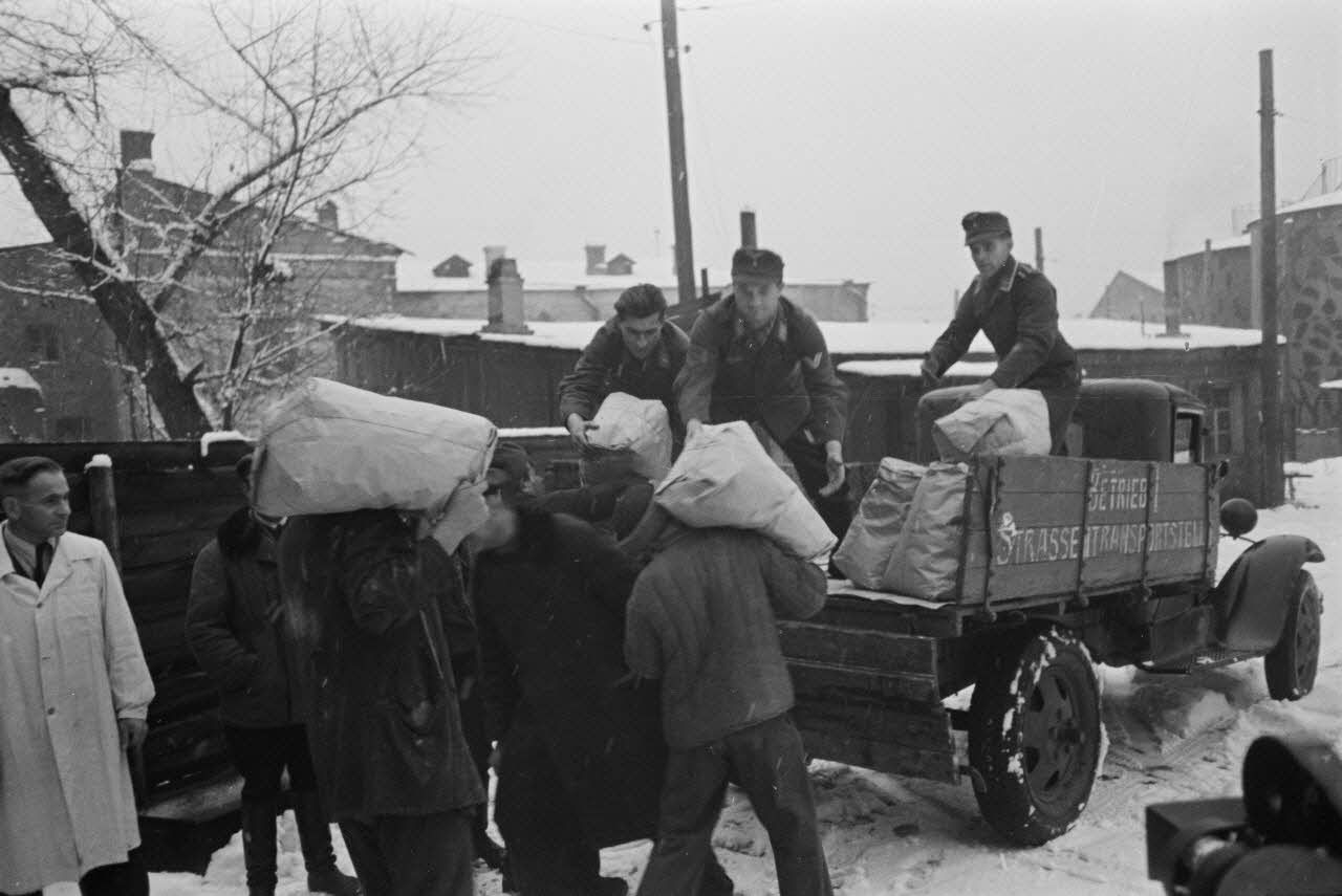 Chargement dans un camion de biscuits fabriqués dans une usine russe réquisitionnée pour les besoins de l'armée de l'air allemande.