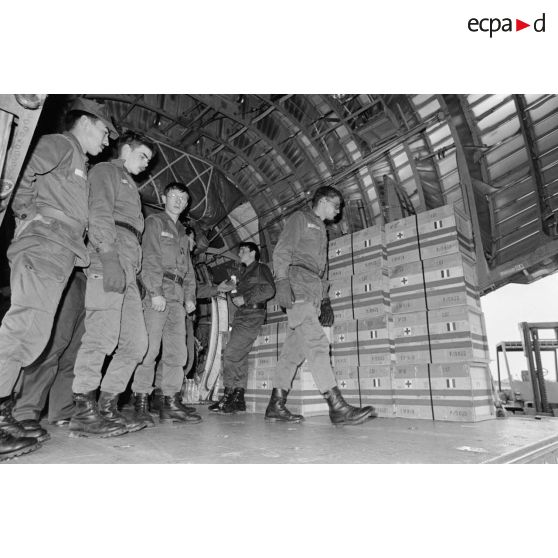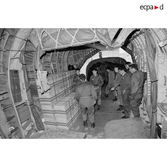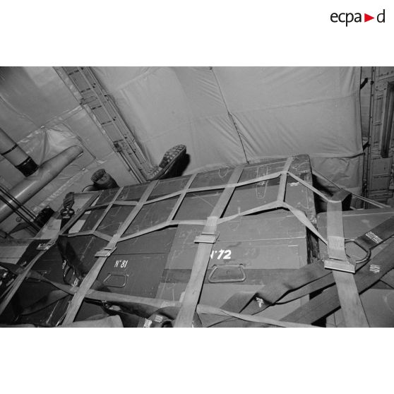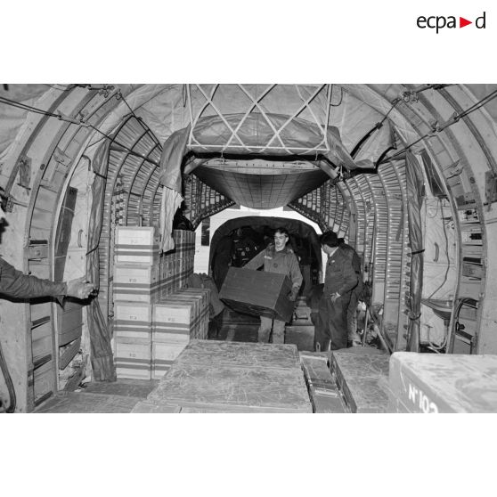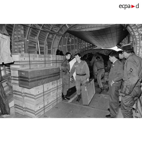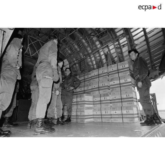 Caisses de matériel médical dans un Transall à destination de N'Djamena.