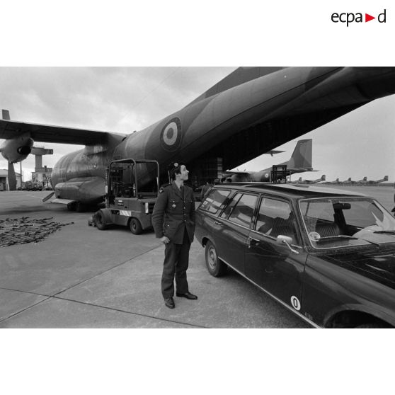 Un militaire du Train, à l'aéroport d'Orléans, devant un Transall.