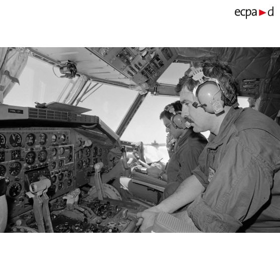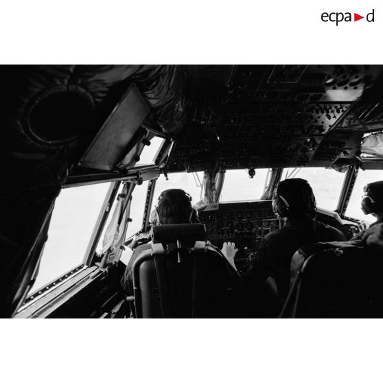 Intérieur de la cabine de pilotage d'un Transall à destination du Tchad.