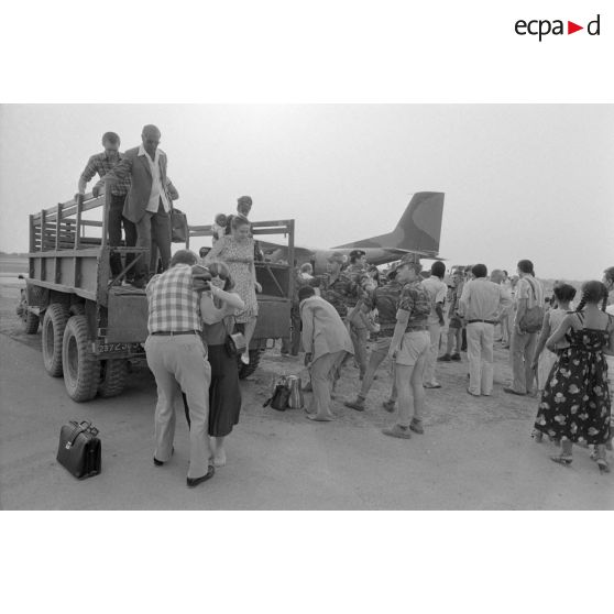 Evacuation de civils qui descendent d'un camion et s'apprêtent à monter dans un Transall, à l'aéroport de N'Djamena.