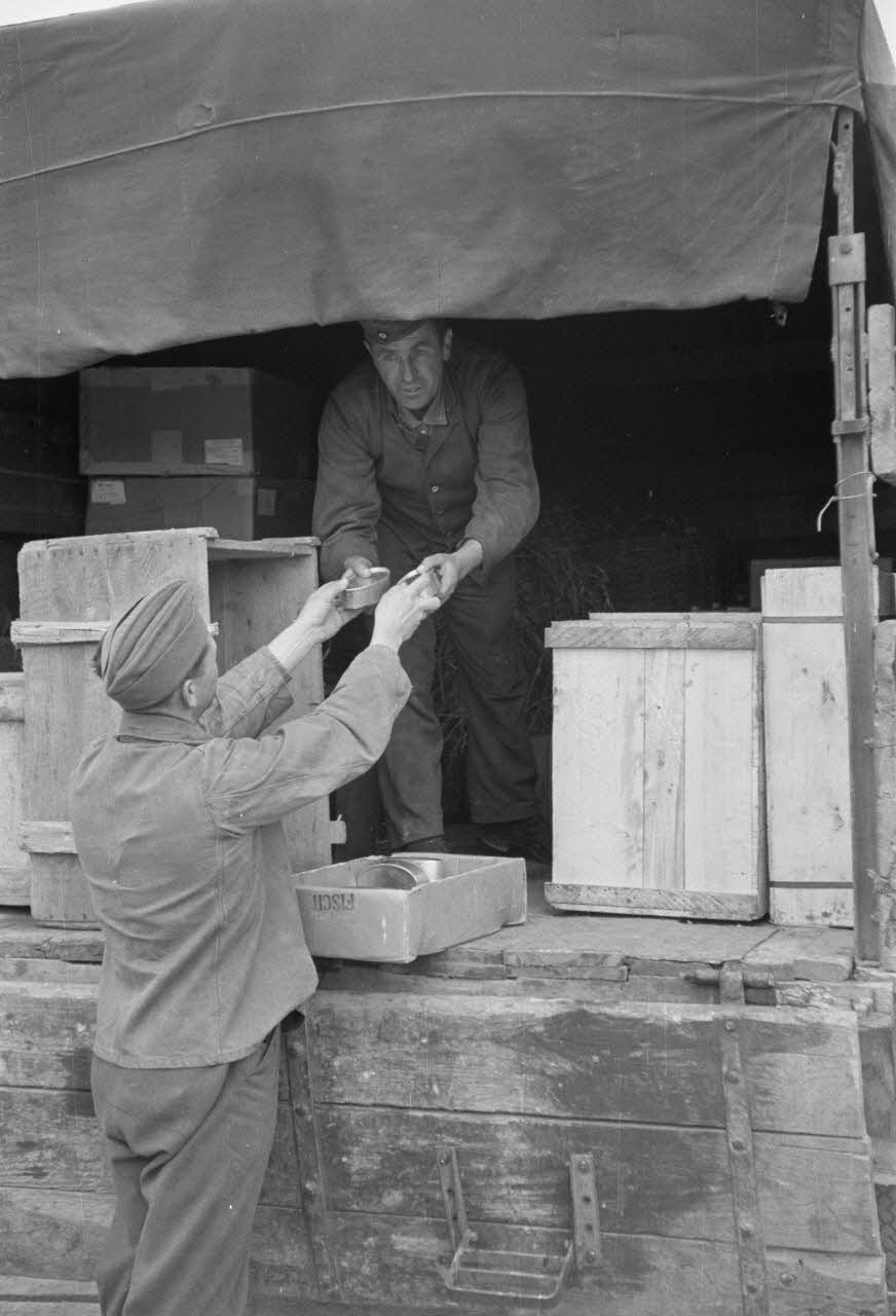 Chargement du ravitaillement dans des camions de l'armée de terre allemande, ici des boites de conserve (repas).