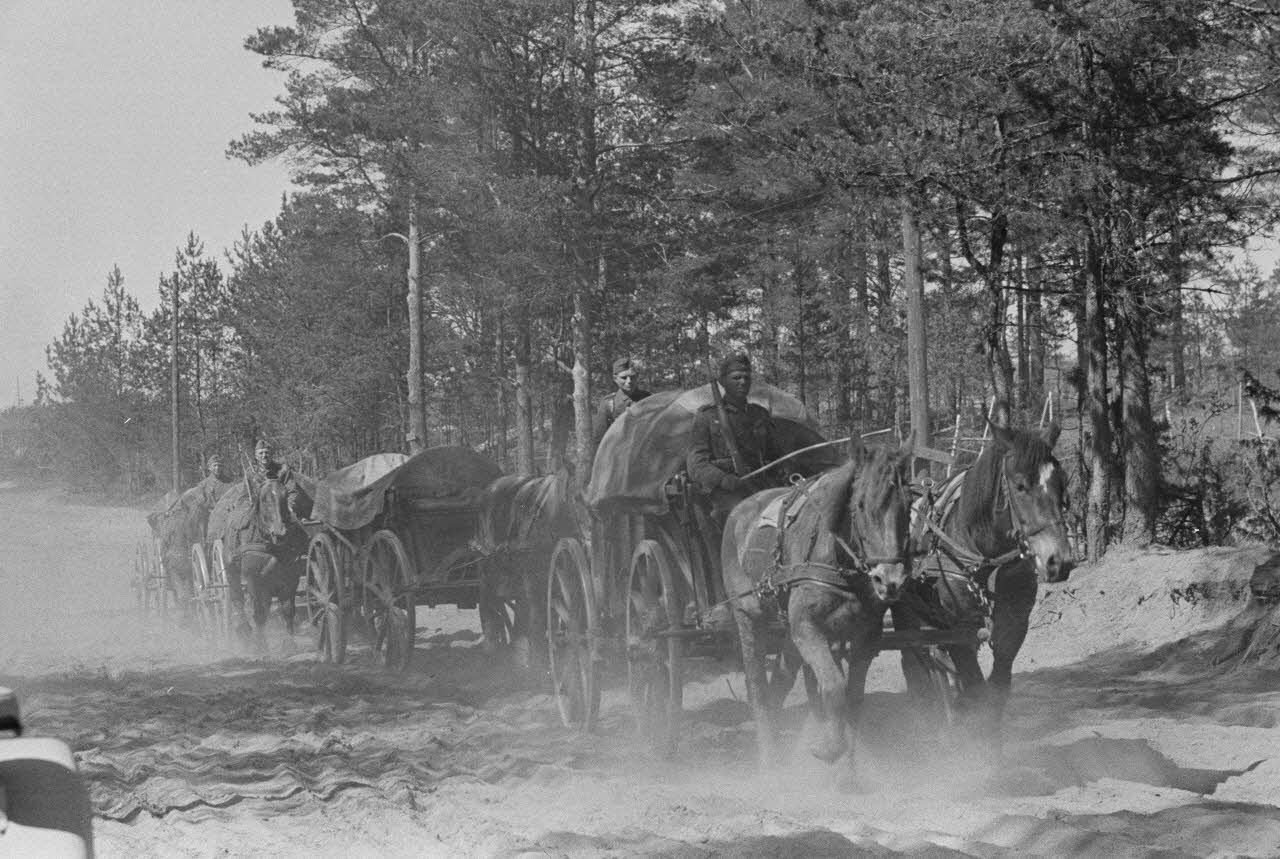 Charrettes hippomobiles du 183e régiment d'infanterie de la 83e division d'infanterie allemande lors d'un défilé.