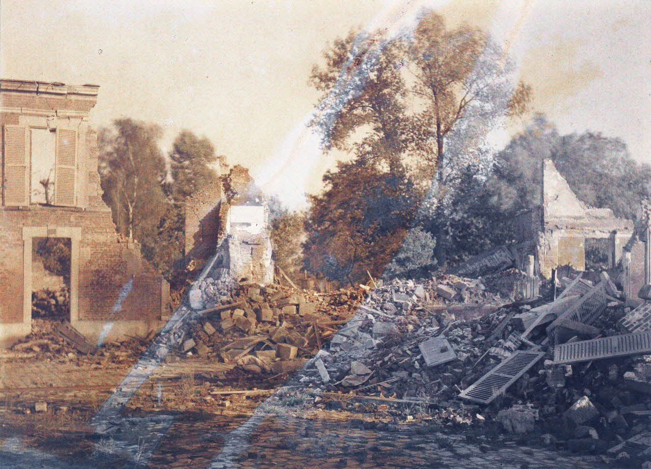 - les ruines et destructions occasionnées par la guerre à Verdun, Reims, Arras ou ailleurs : maisons, églises, cathédrales, lieux symboliques des grandes villes de province en ruines ;