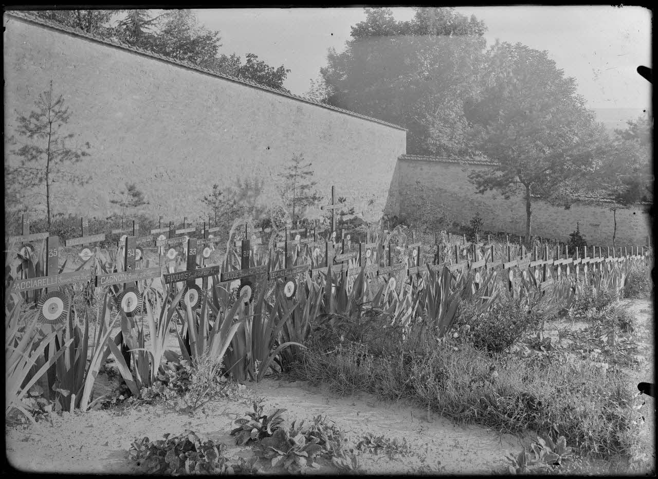 Vue d'un coin du cimetière militaire de Chenay, où reposent des soldats tués au cours de la première bataille de la Marne. On distingue les noms de Pacciarelli, Cagnon, Ruquois, Lecanu etc.