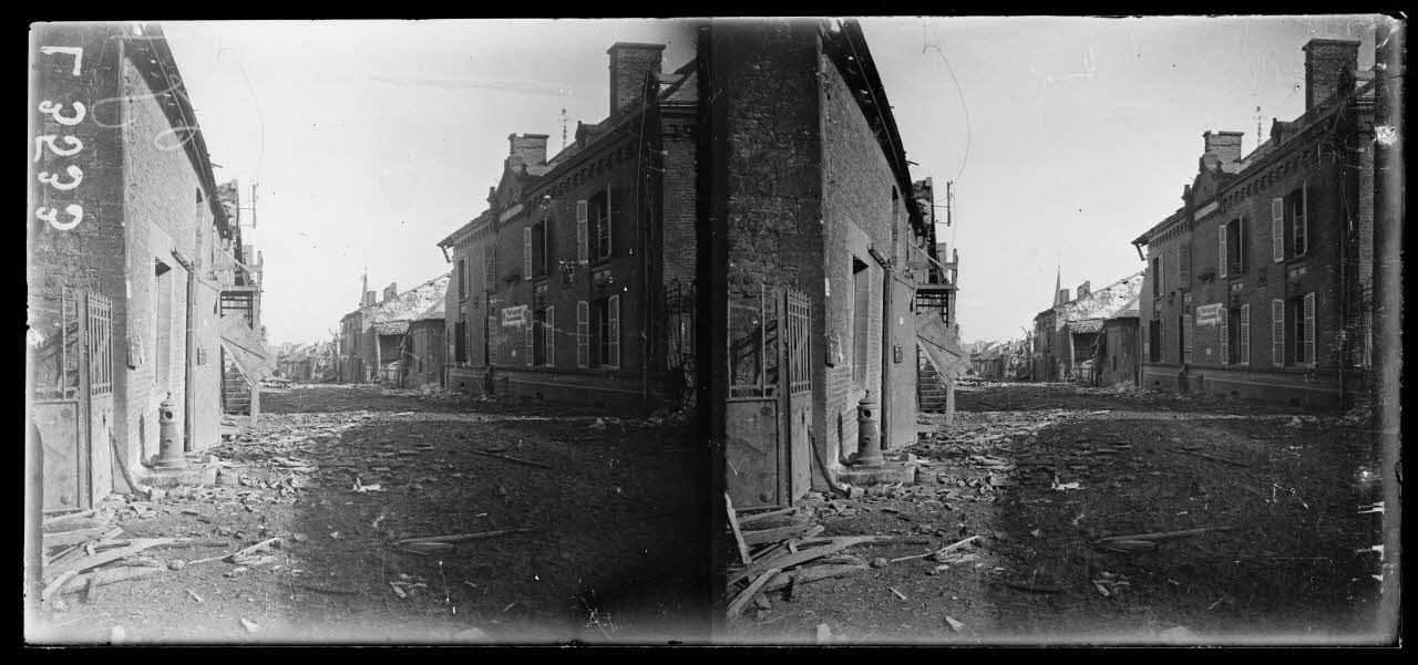 - à Ribécourt-Dreslincourt, des voitures de ravitaillement hippomobiles du 55e BCP (bataillon du chasseurs à pied) traversent le village en ruine (SPA 76 L 3521), les ruines de l'église (SPA 76 L 3522), des soldats français et des ambulances américaines (SPA 76 L 3523) ;