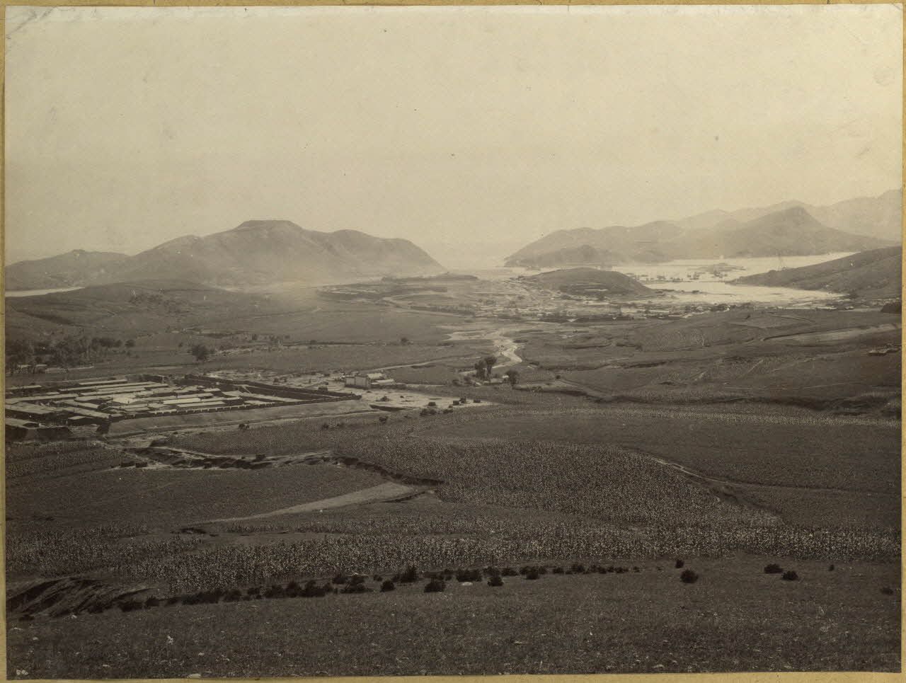 [Chine, 1887-1891. Panorama d'un bord de mer avec de nombreux bâtiments dont un camp militaire entouré de champs de sorgho].