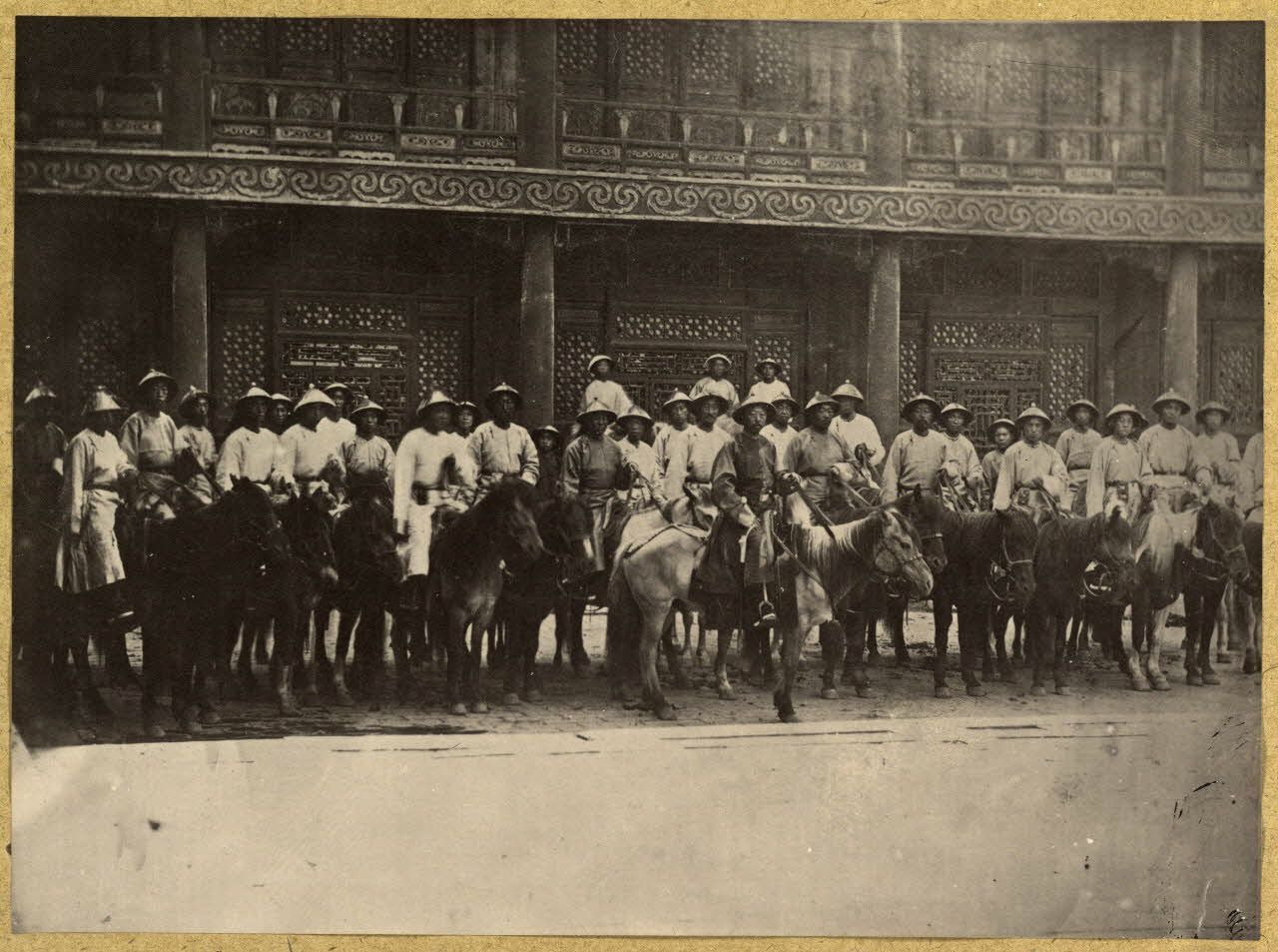 [Chine, 1888-1890. Cavaliers de l'armée impériale chinoise devant une école militaire dans les environs de Tien-Tsin].