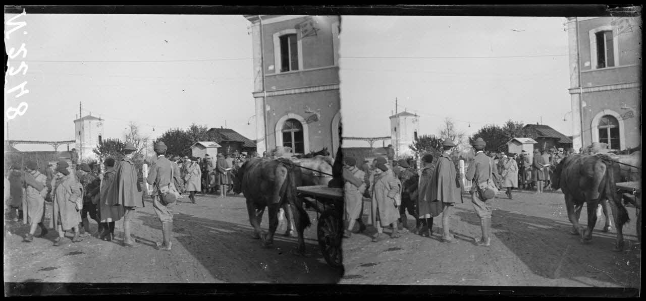 Citadelle (Italie). Chasseurs alpins français devant la gare (18-1-18).