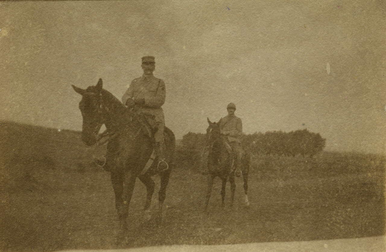 Colonel Desbareau à cheval sortant de son P.C. à Levignen. Nouveau colonel depuis le 26 mai 1917.