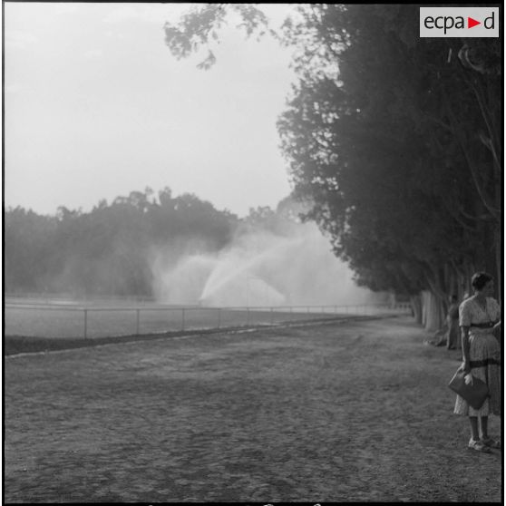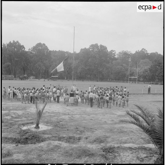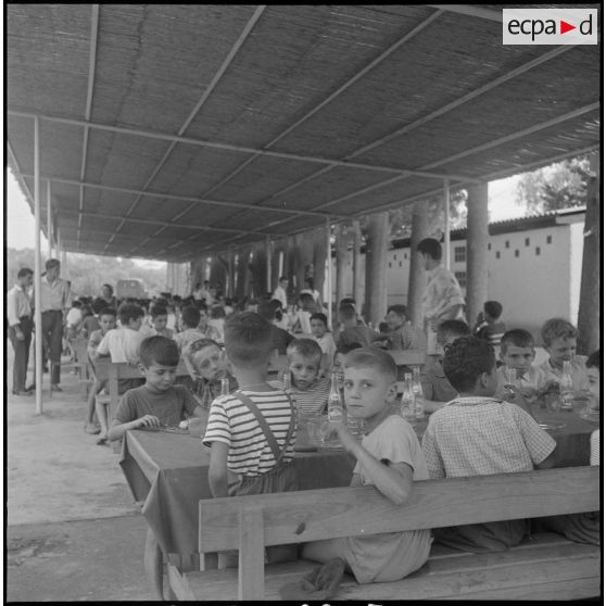 Visite dans un centre accueillant des enfants pour une colonie de vacances. Les enfants photographiés à table pour un repas (R1, R2, R5, R10). Jean Bobet visite la colonie de vacances et reçoit un bouquet de fleurs (R3, R4). Vue sur l’arrosage automatique en action sur un terrain de sport (R6, R7, R9). Une pancarte présente les lieux comme étant le Parc des Princes (R8). Les enfants assistent au lever des couleurs (R11).