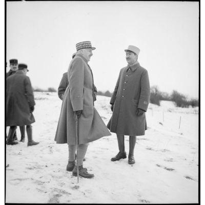 Général de corps d'armée de la 9e armée, en compagnie d'officiers d'état-major et d'un commandant d'une unité coloniale dans un décor enneigé.