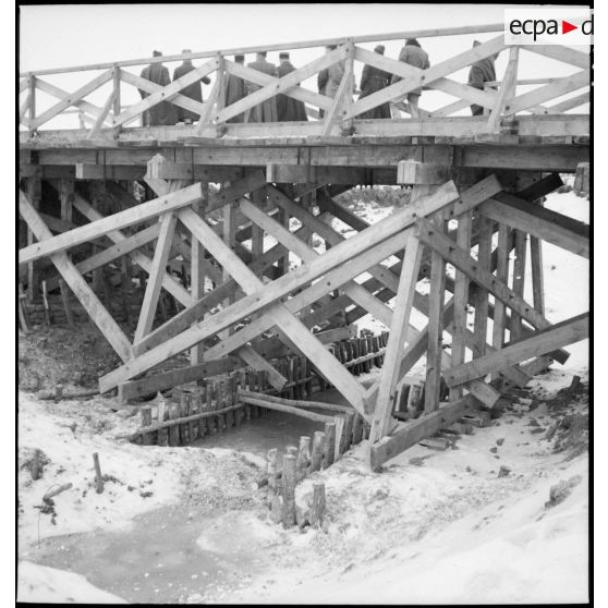 Colonel détaché de l'état-major et général de corps d'armée sur un pont en bois récemment construit dans le secteur de la 9e armée.