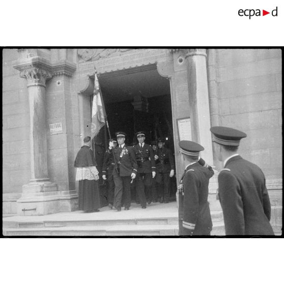 Le drapeau d'une unité aérienne et sa garde d'honneur défilent devant les autorités à l'issue de la cérémonie.
