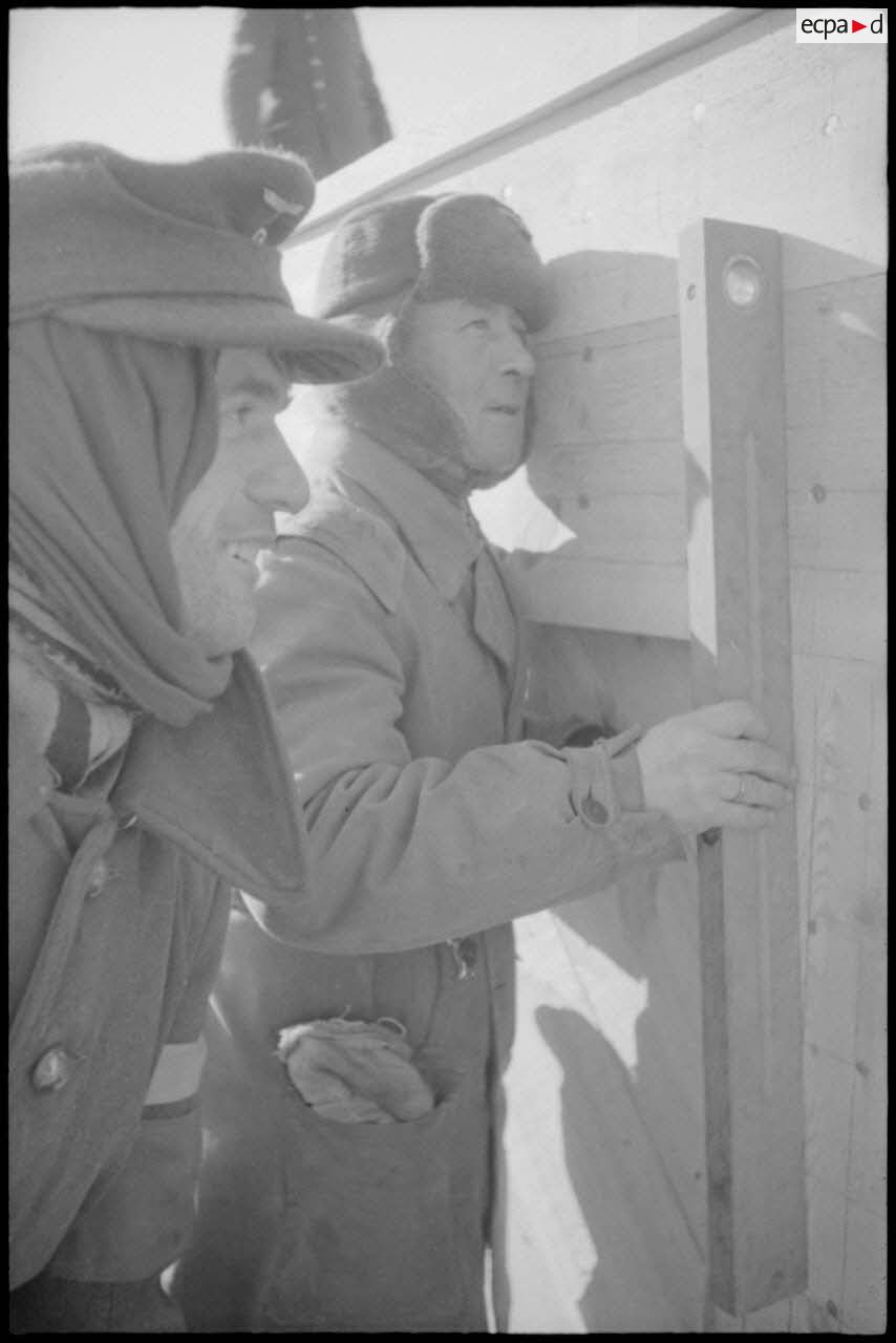 Un prisonnier soviétique, employé à la construction d'un pont, s'intéresse à l'appareil photographique Leica du reporter.