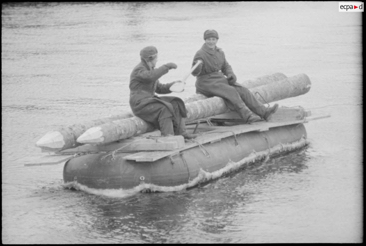 Alors que le pont est en construction, un pont moins important construit parallèlement permet la traversée de la rivière. Sur le pont en construction, les ouvriers de l'OT (Organisation Todt) et les prisonniers soviétiques travaillent sous l'œil du reporter. On reconnaît le brassard de l'OT.