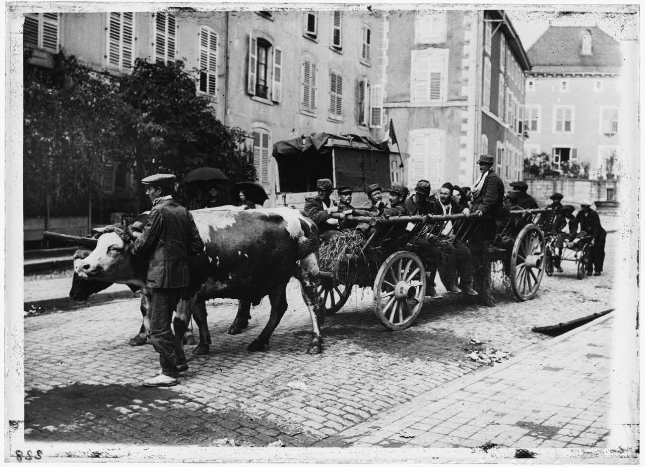 Convoi de blessés dans Bruyères. Vosges, août 1914. [légende d'origine]
