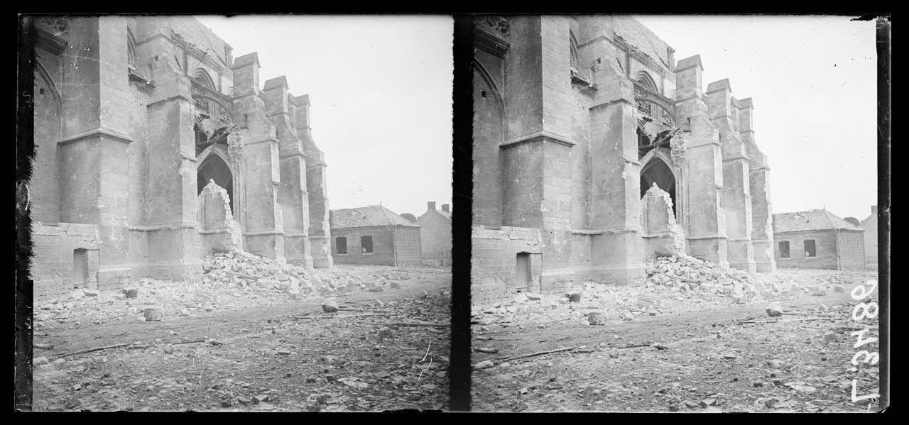 Corbie. Somme. Maisons détruites. Au fond, la cathédrale.