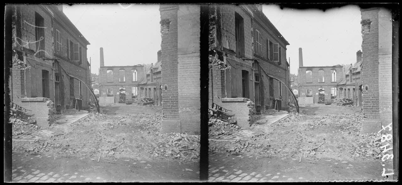 Corbie. Somme. Maisons détruites. Au fond, la cathédrale.