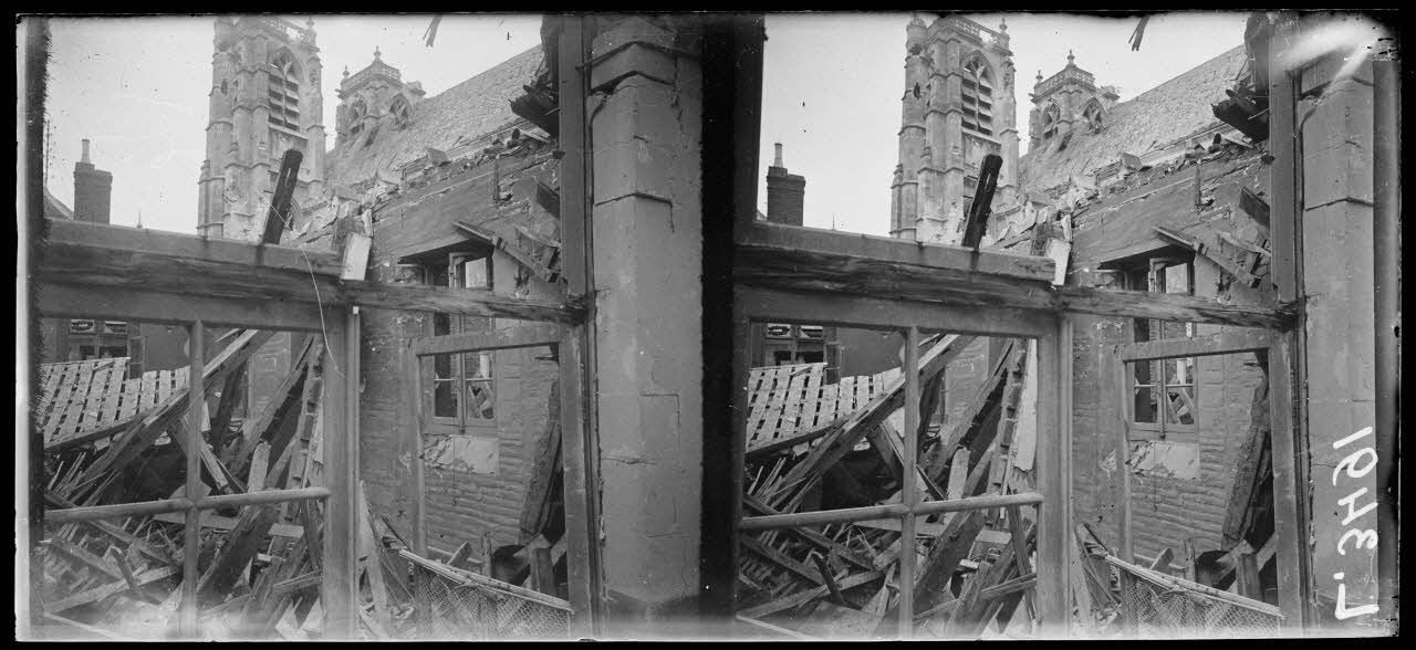 Corbie. Somme. Maisons détruites. Au fond, la cathédrale.
