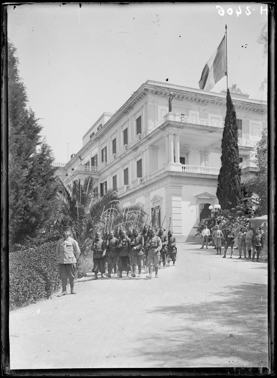 Corfou. A l'Achilleion, la relève de la garde (10e bataillon de zouaves). [légende d'origine]