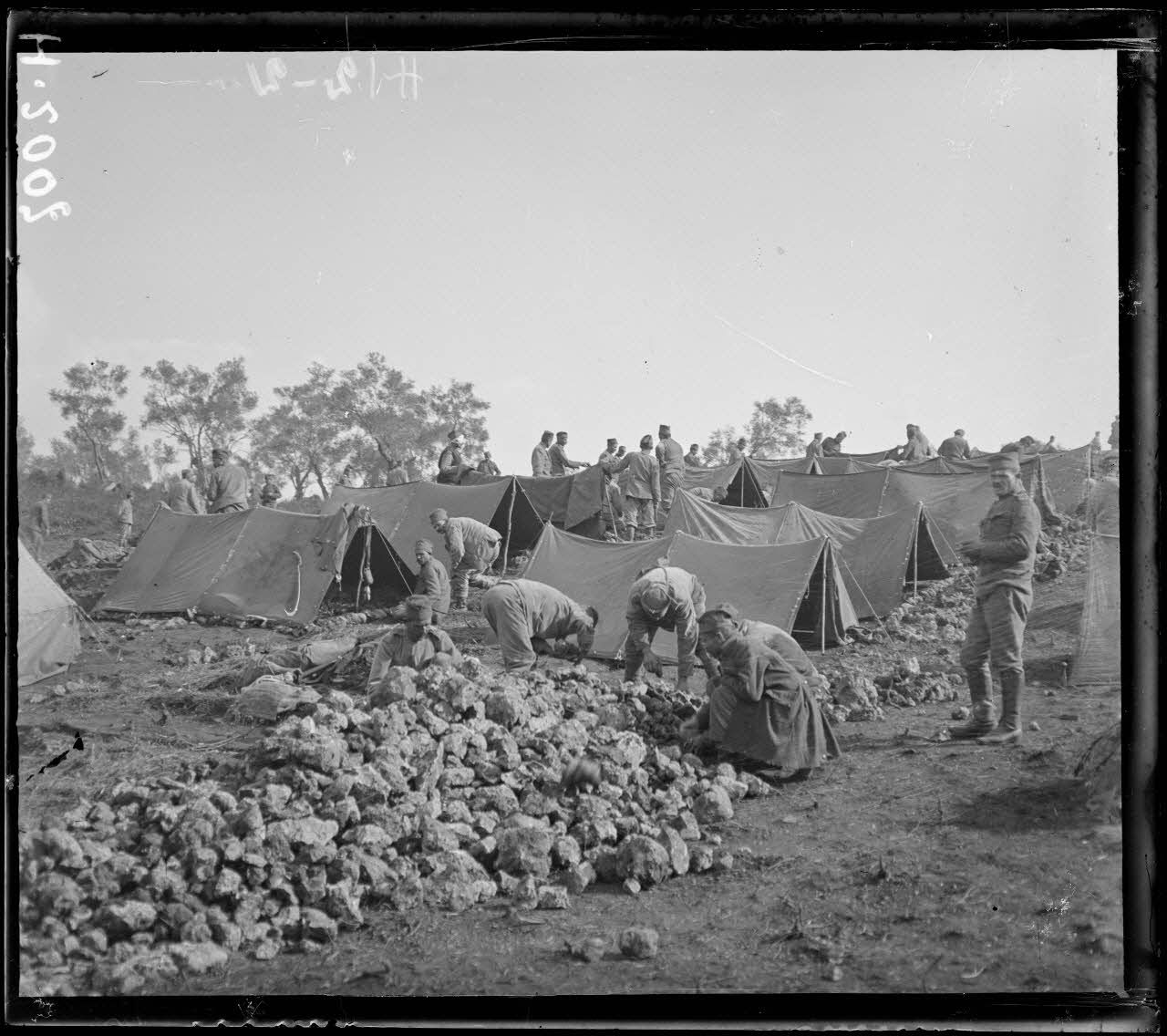 Sur la jetée du camp de Moraitika, les chalands arrivés sont déchargés des caisses de fusils et des sacs d'avoine qu'ils transportent. Sur le camp, les fours de boulangerie de campagne avoisinent les cuisines des troupes britanniques du génie. Une carrière est ouverte par des soldats serbes du génie pendant que d'autres se rendent au magasin à pains pour ravitailler les camps alentours. Des hommes entassent des résidus de noyaux d'olives qui serviront de combustible.