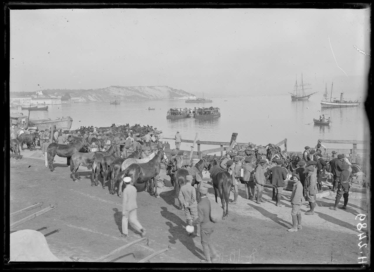 Corfou. Embarquement de mulets du 6e alpin. [légende d'origine]