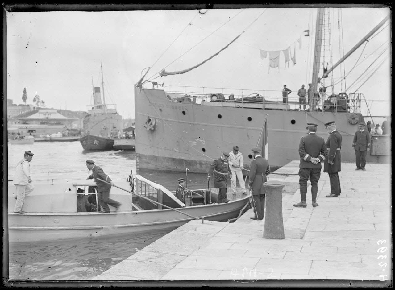 Le 7 avril, l'amiral Charlier débarque du croiseur "Waldeck-Rousseau" en cours de nettoyage, pour rendre visite au gouverneur de Corfou.