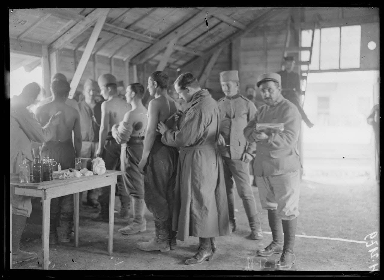 Sur les quais, des soldats serbes sont vaccinés contre le choléra. Une baraque Adrian (construction provisoire en bois et métal) longue de 46 mètres sert de magasin d'artillerie.